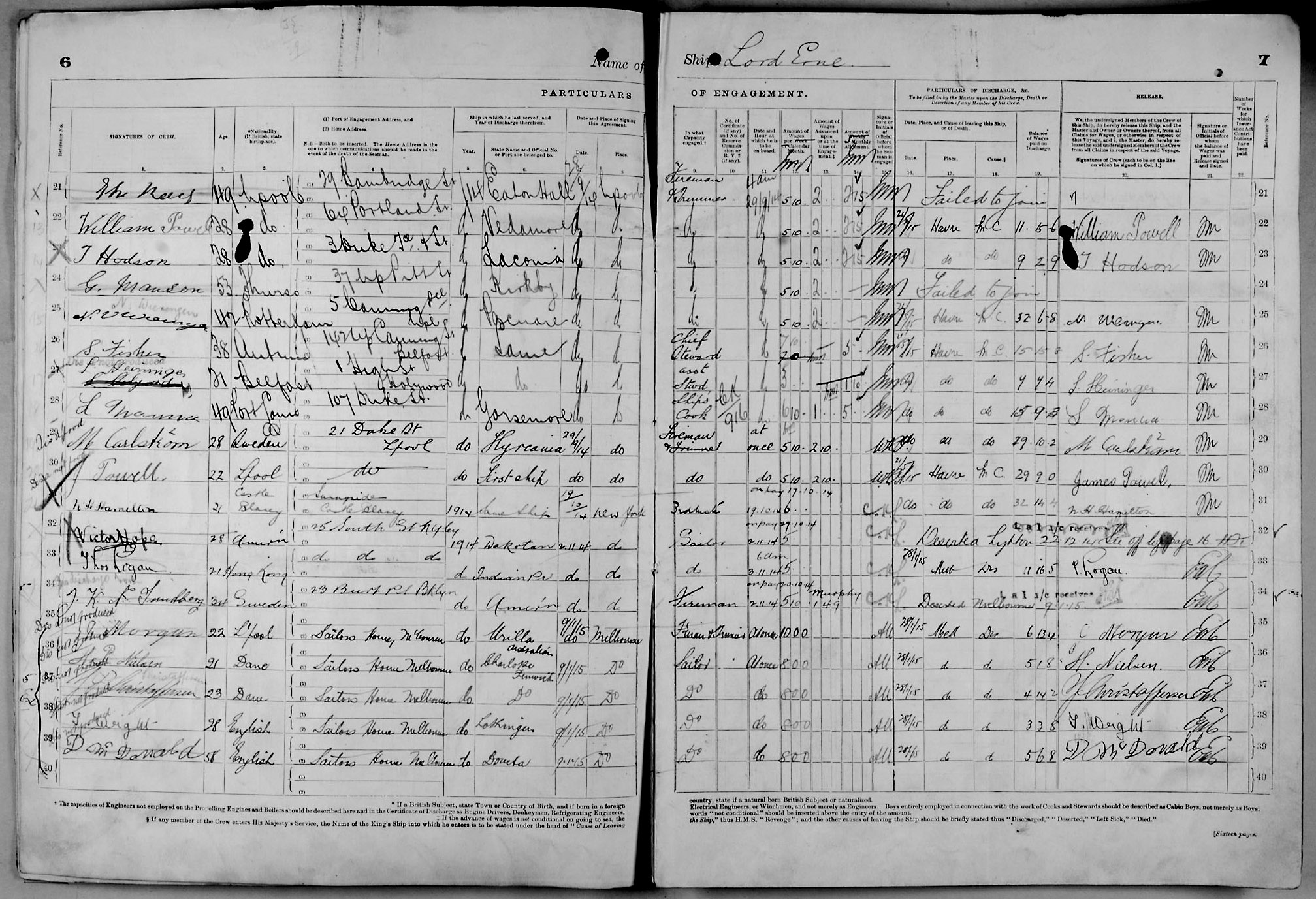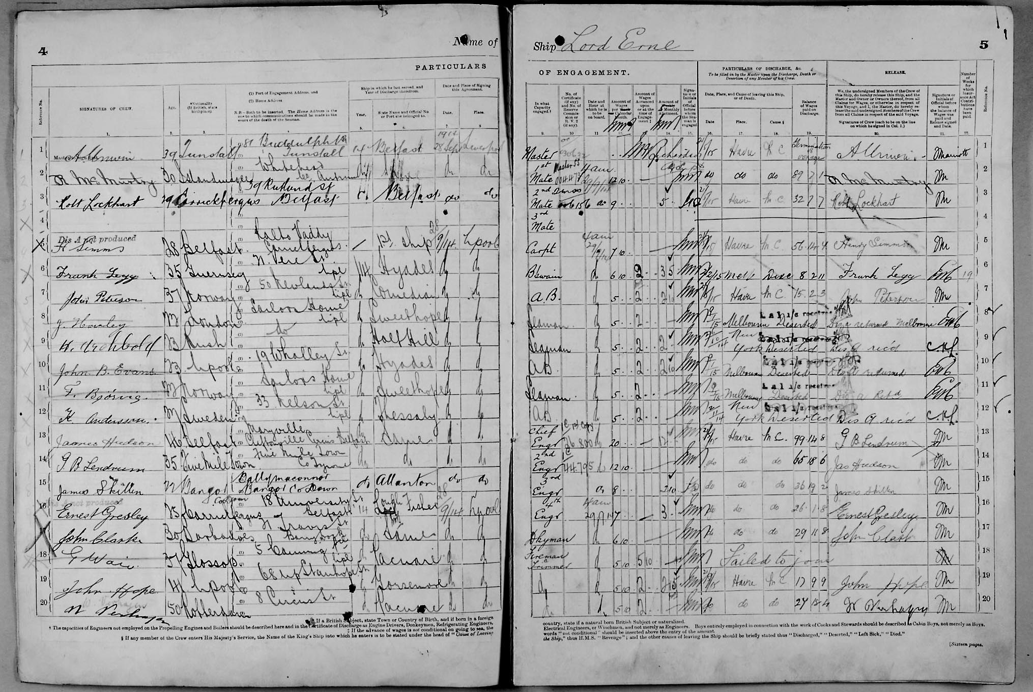Crew list document for vessel 'LORD ERNE'