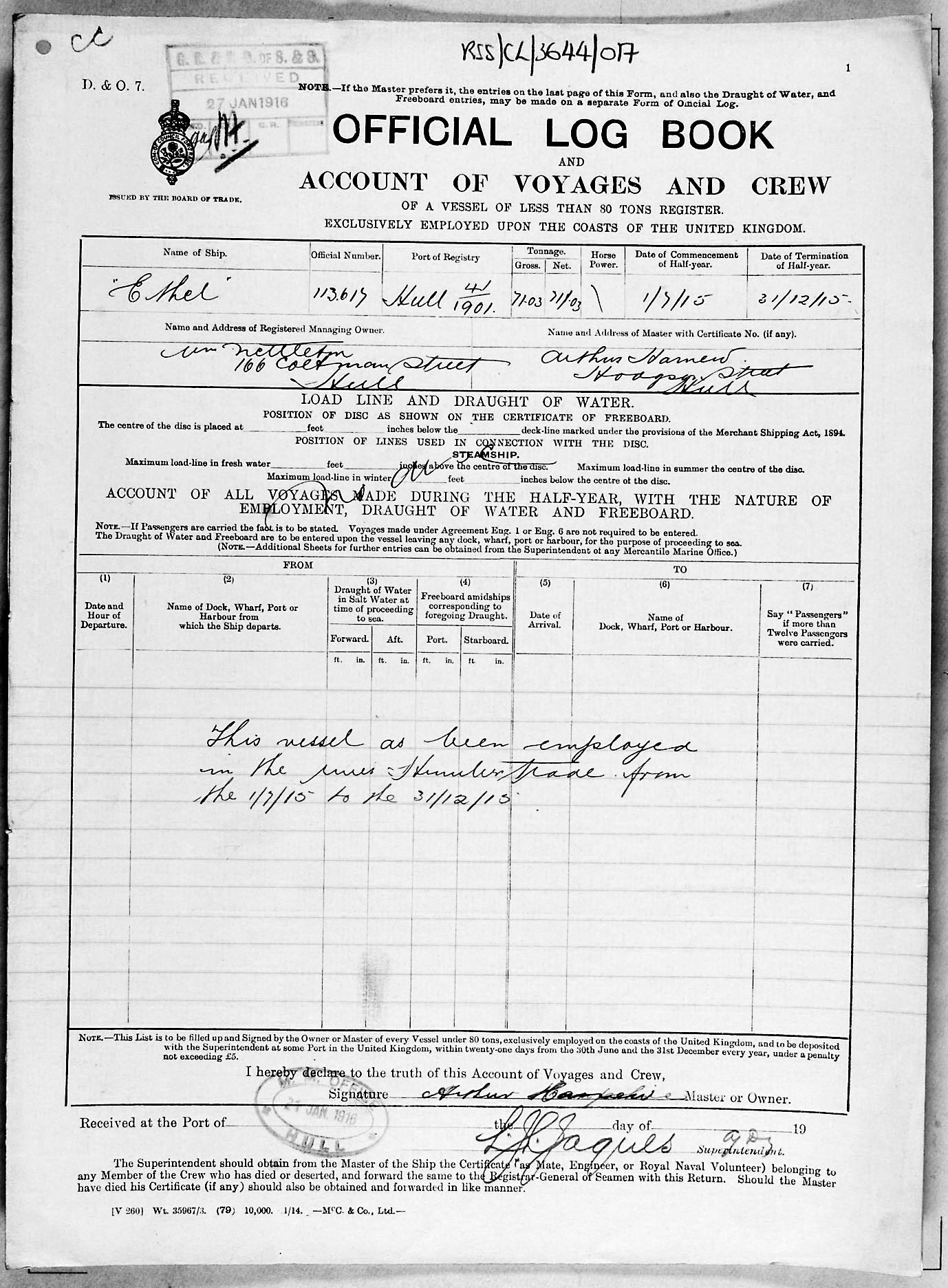 Crew list document for vessel 'ETHEL'