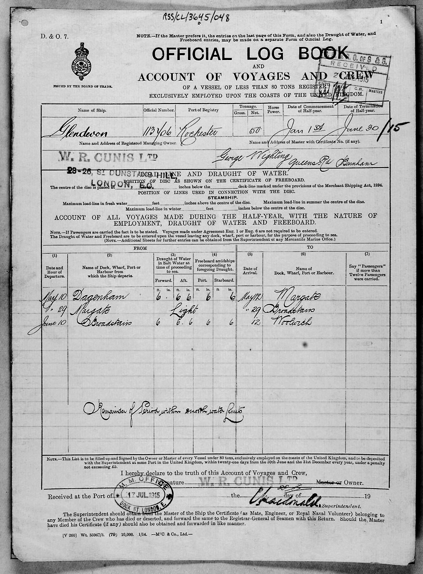 1915 crew list for the vessel 'GLENDEVON'