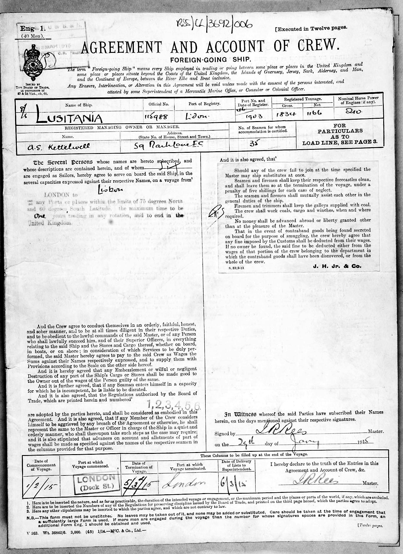 Crew list document for vessel 'LUSITANIA'