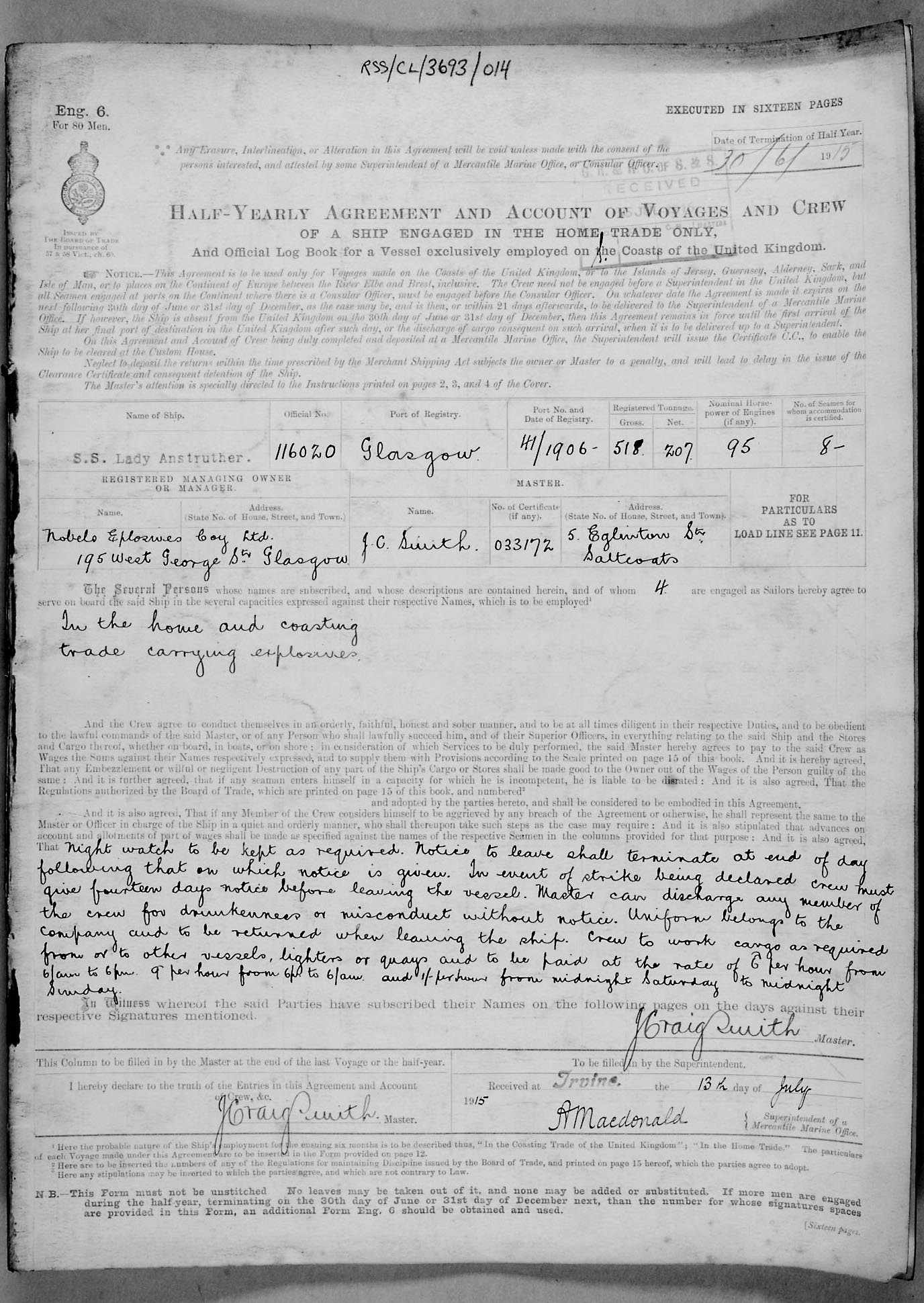 1915 crew list for the vessel 'LADY ANSTRUTHER'