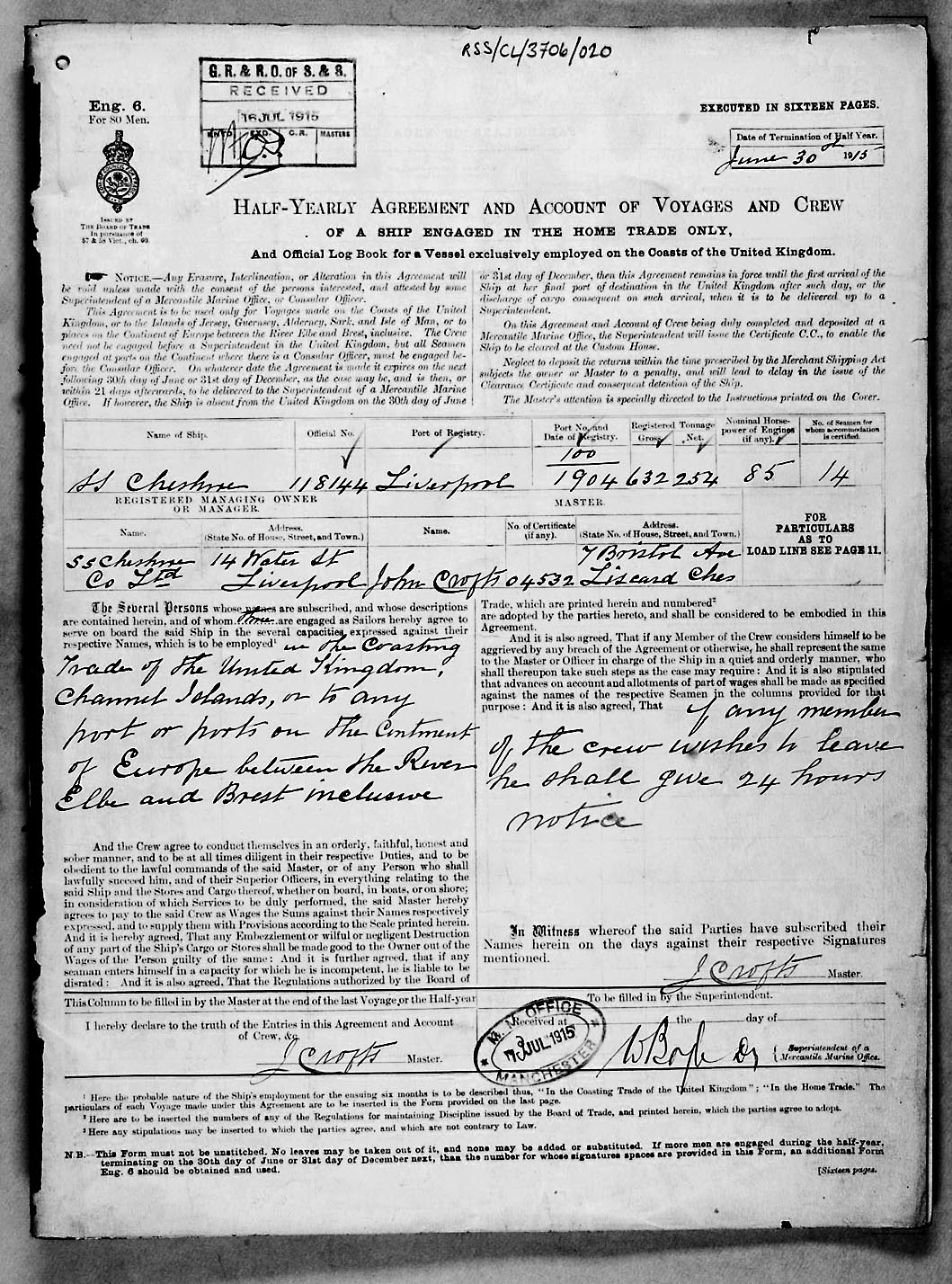 Crew list document for vessel 'CHESHIRE'
