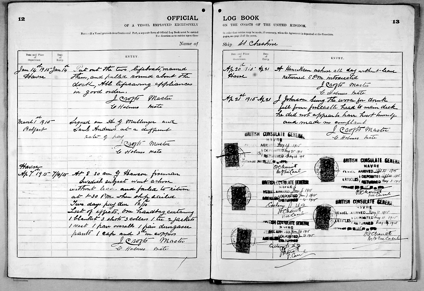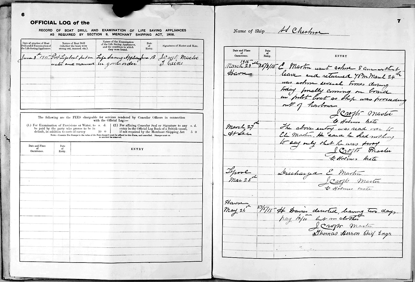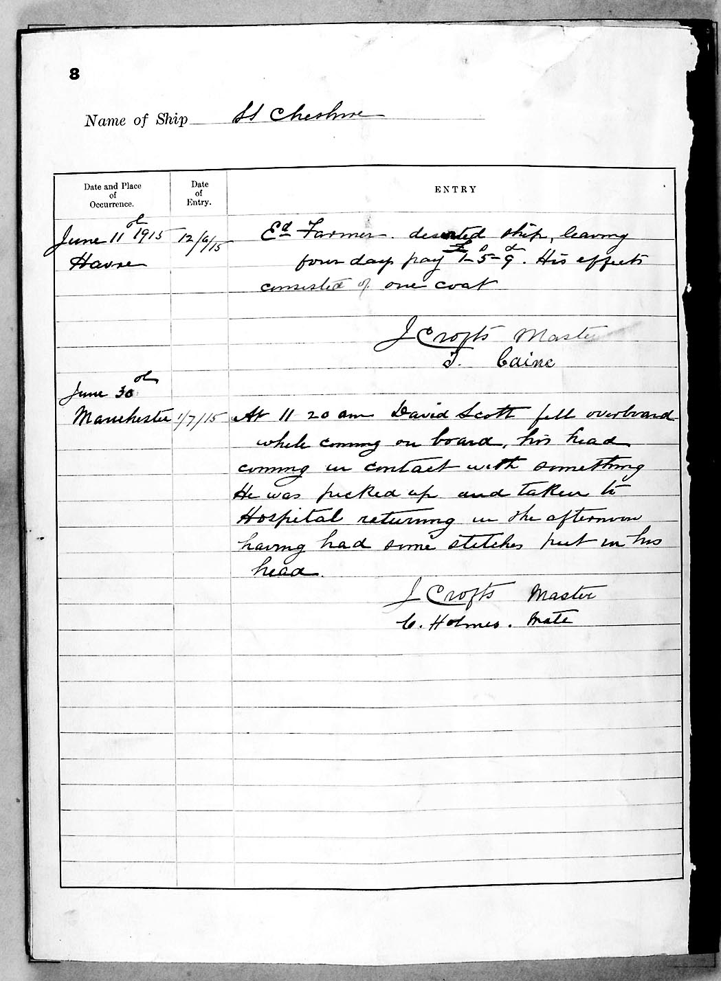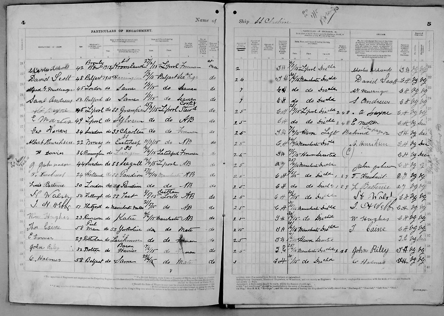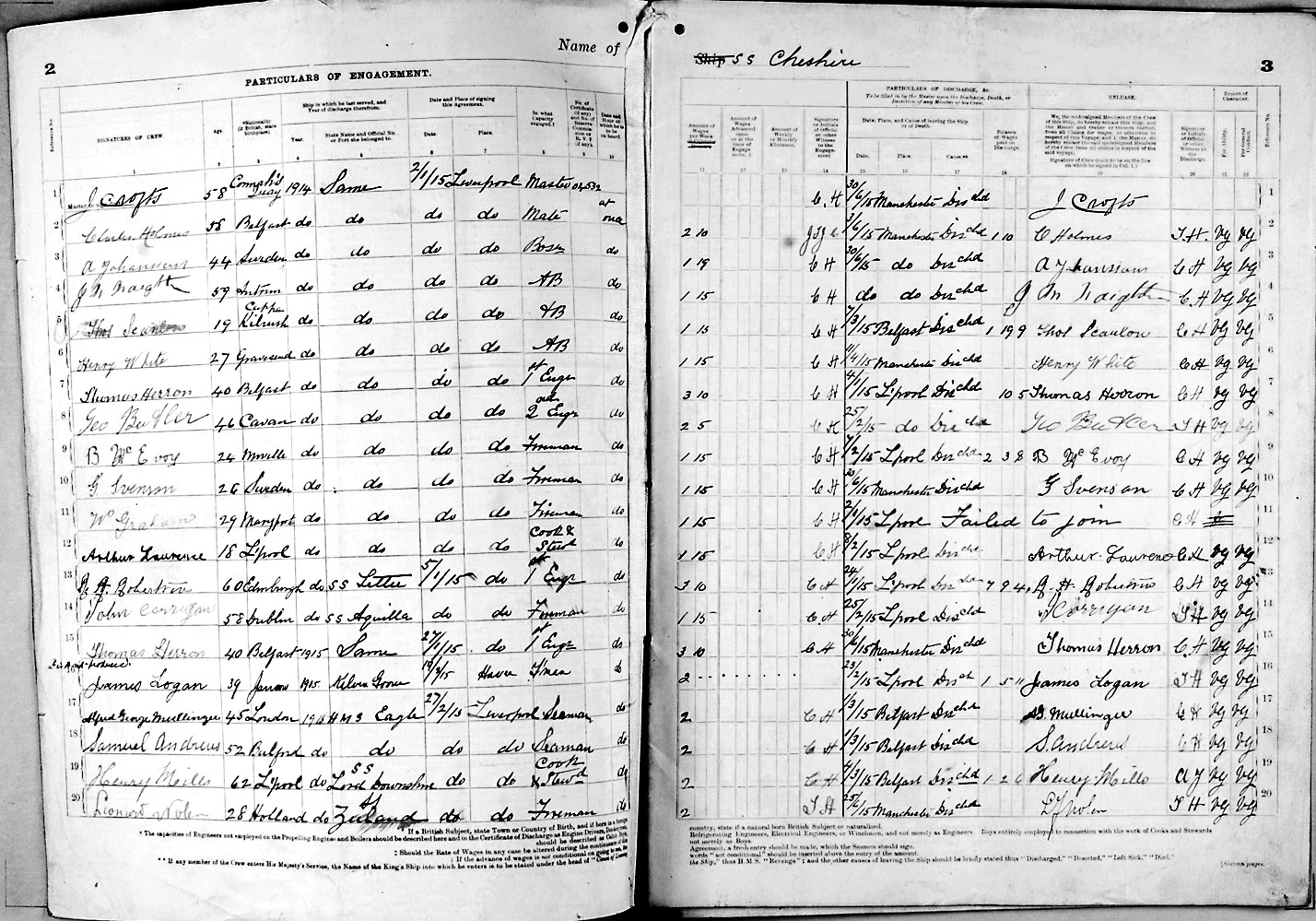 1915 crew list for the vessel 'CHESHIRE'