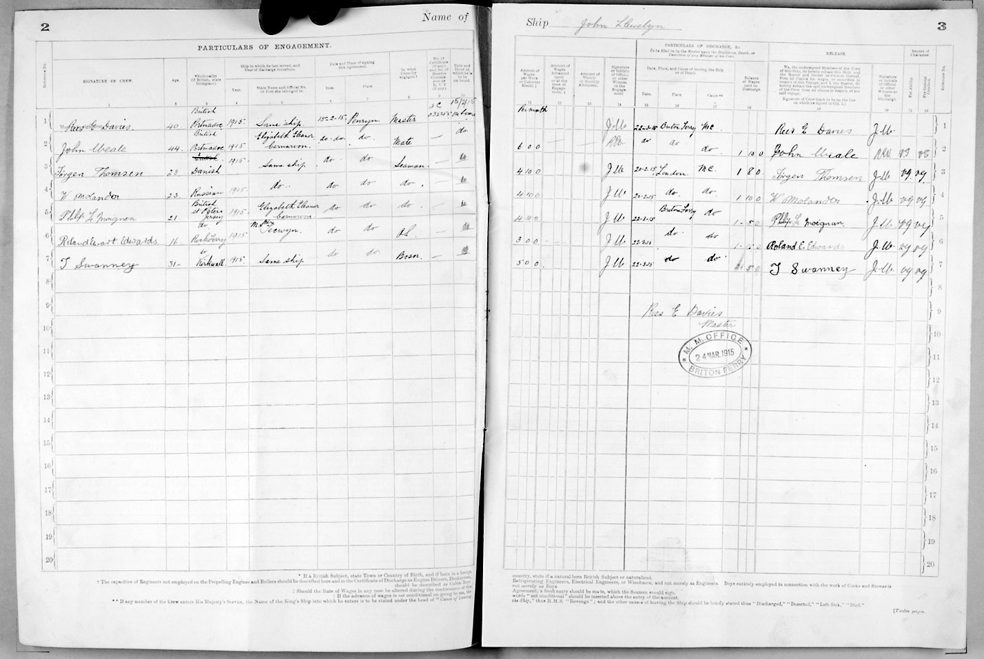 1915 crew list for the vessel 'JOHN LLEWELYN'
