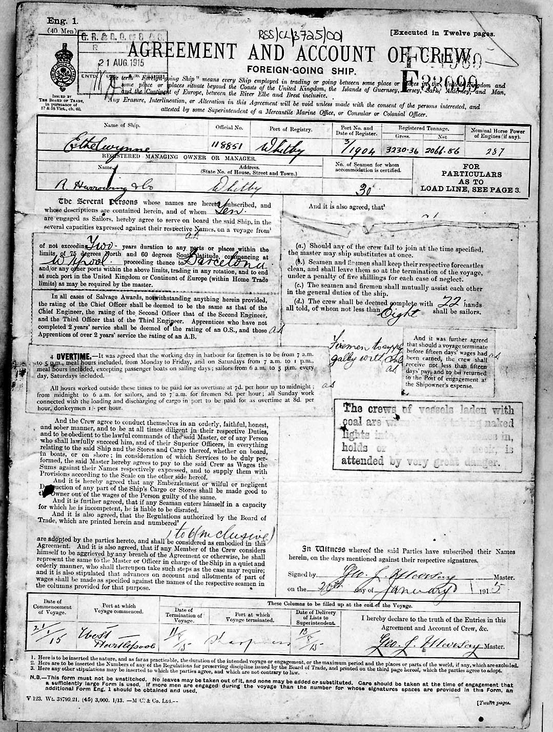 1915 crew list for the vessel 'ETHELWYNNE'