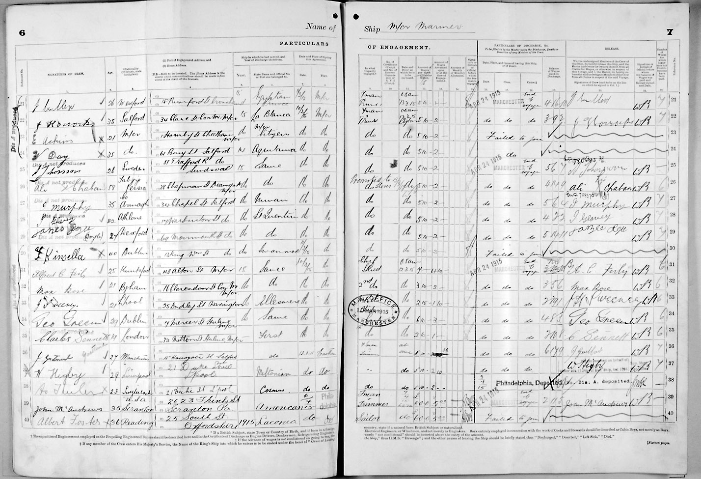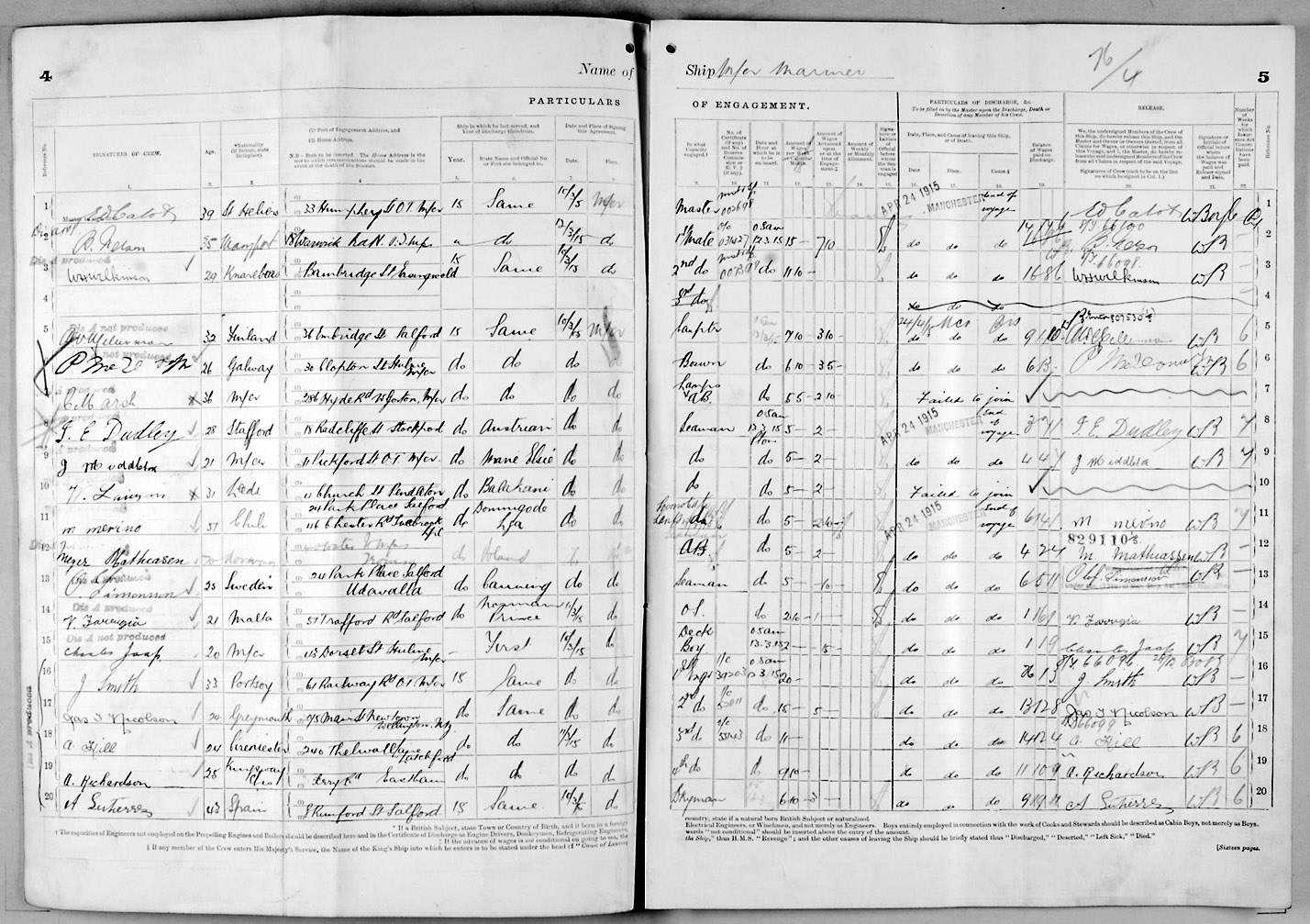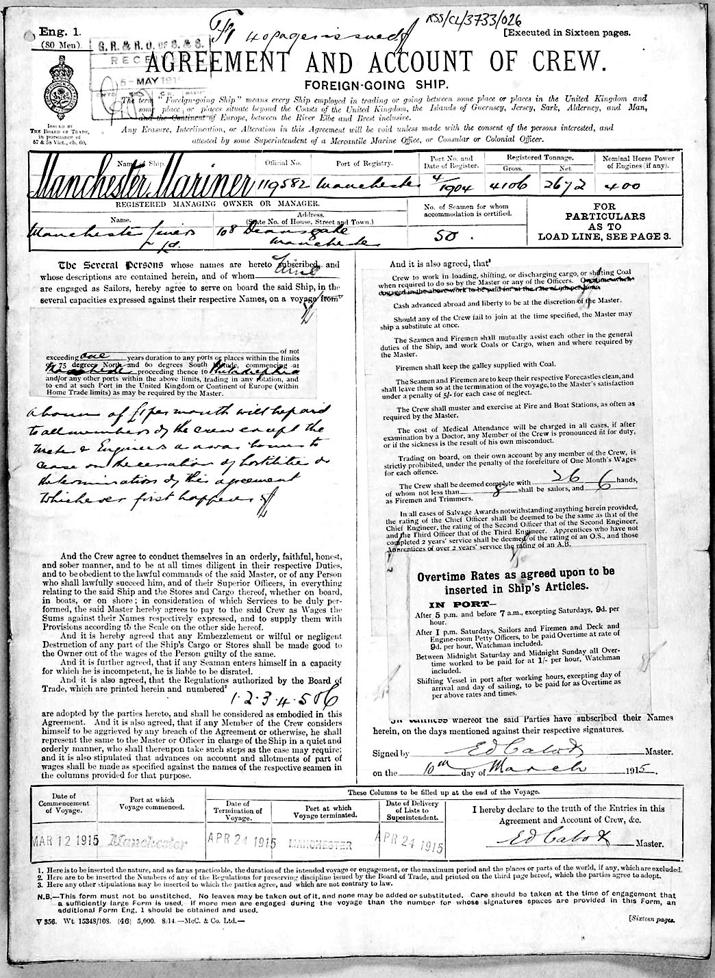 1915 crew list for the vessel 'MANCHESTER MARINER'