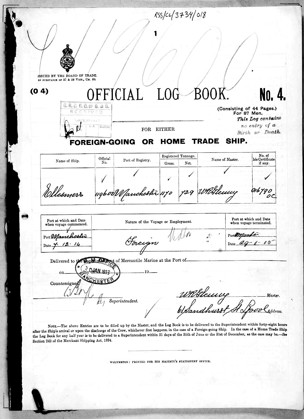1915 crew list for the vessel 'ELLESMERE'