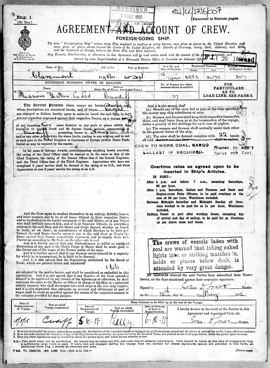 1915 crew list for the vessel 'CLAREMONT'