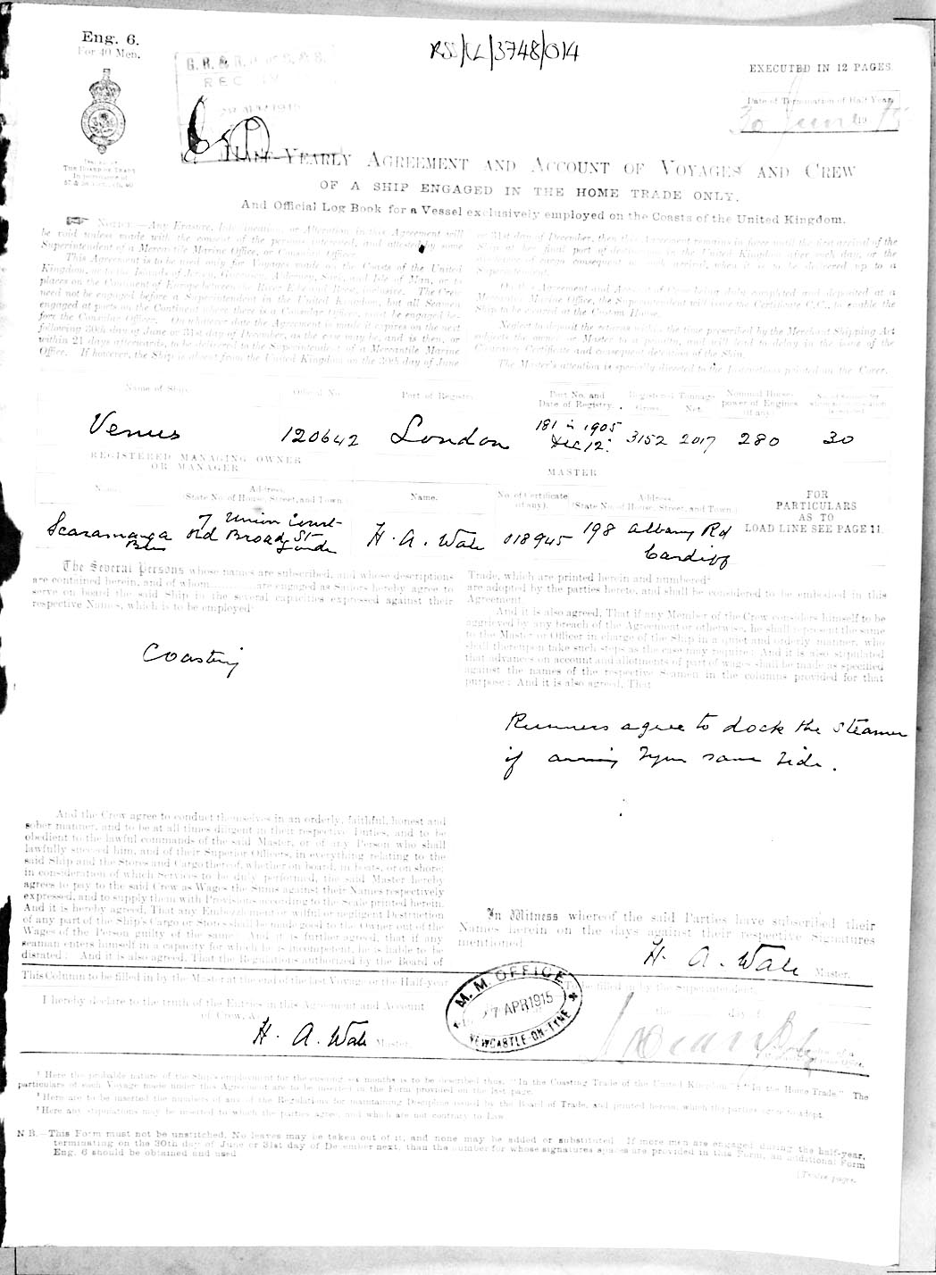 1915 crew list for the vessel 'VENUS'
