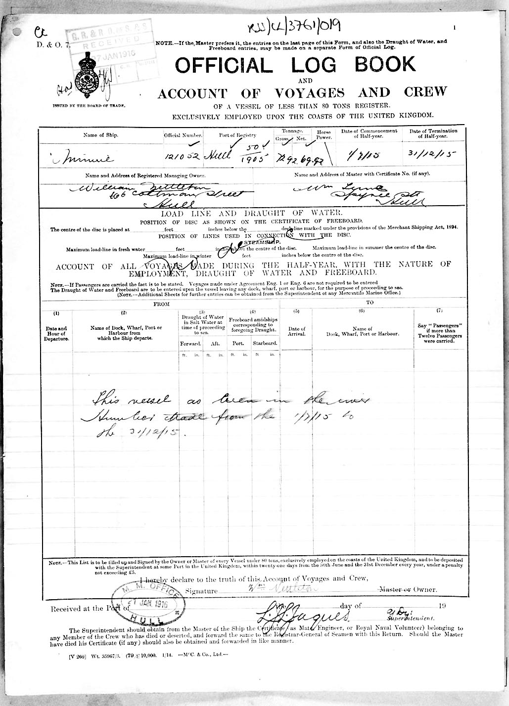 1915 crew list for the vessel 'MINNIE'