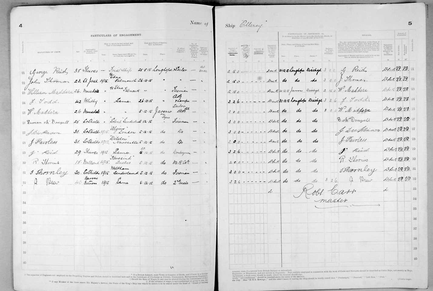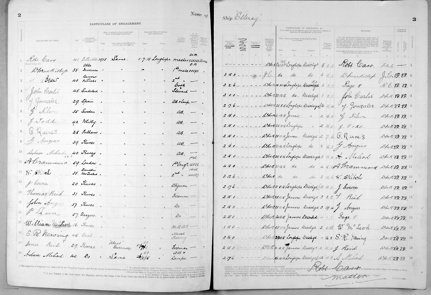 1915 crew list for the vessel 'ELLERAY'