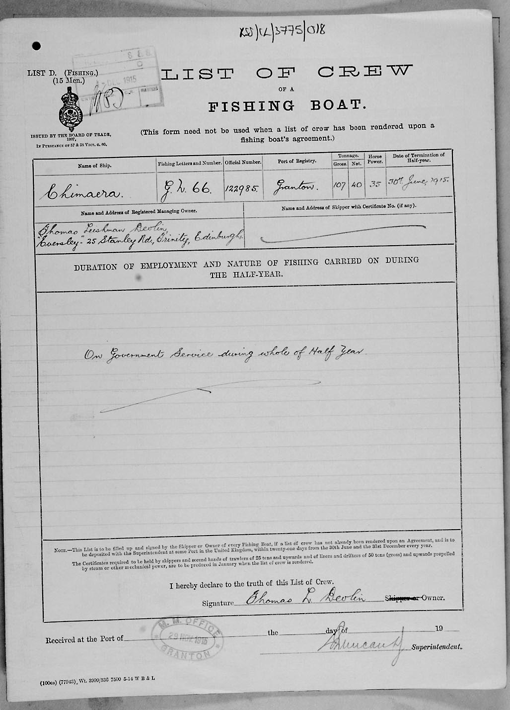 Crew list document for vessel 'CHIMAERA'