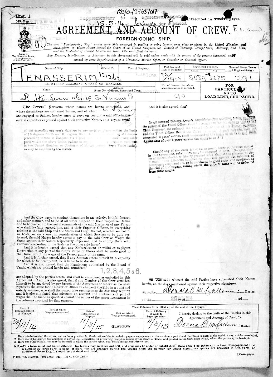 Crew list document for vessel 'TENASSERIM'