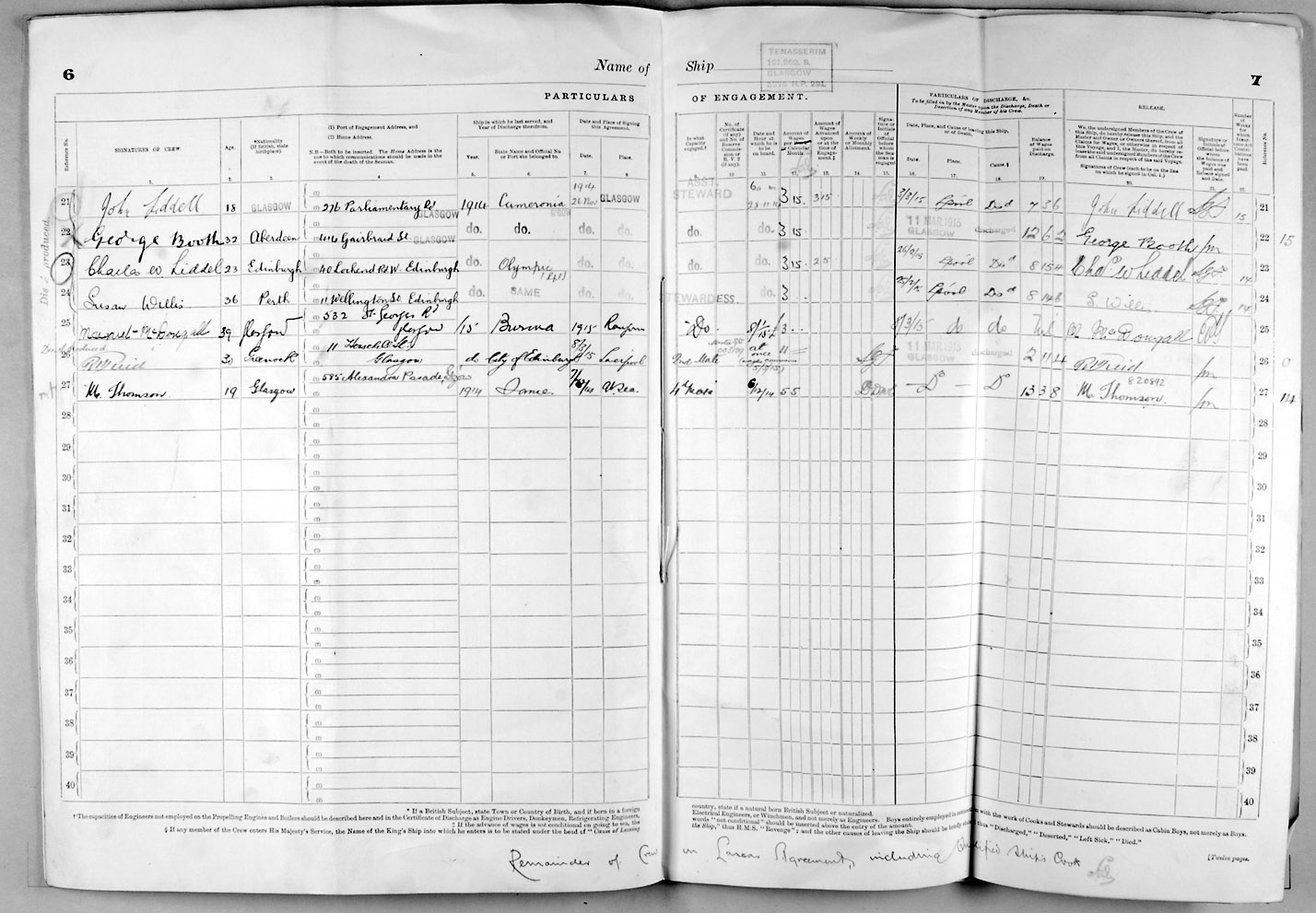 1915 crew list for the vessel 'TENASSERIM'