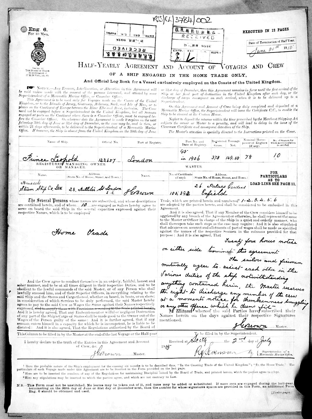 1915 crew list for the vessel 'PRINCE LEOPOLD'