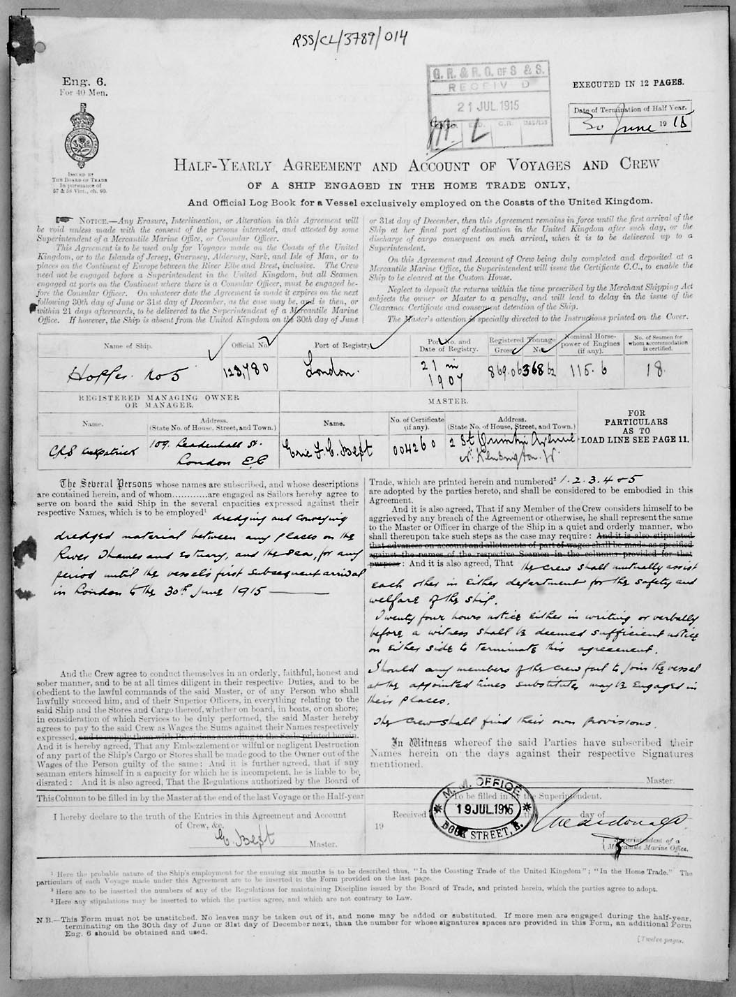 1915 crew list for the vessel 'THAMES CONSERVANCY HOPPER NO 5'