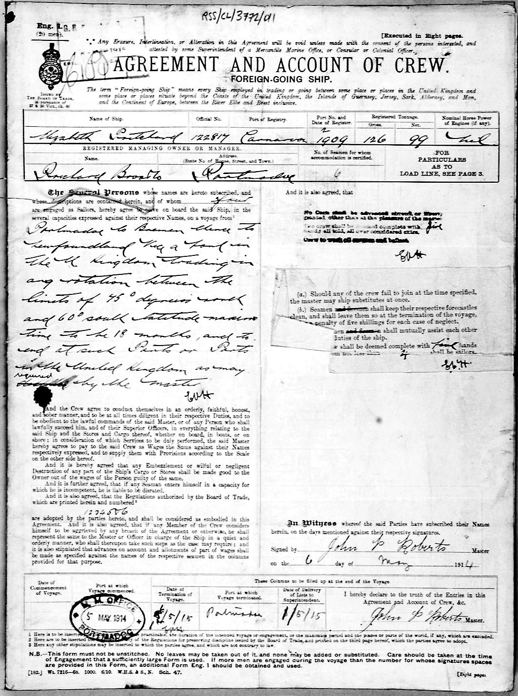 1915 crew list for the vessel 'ELIZABETH PRITCHARD'