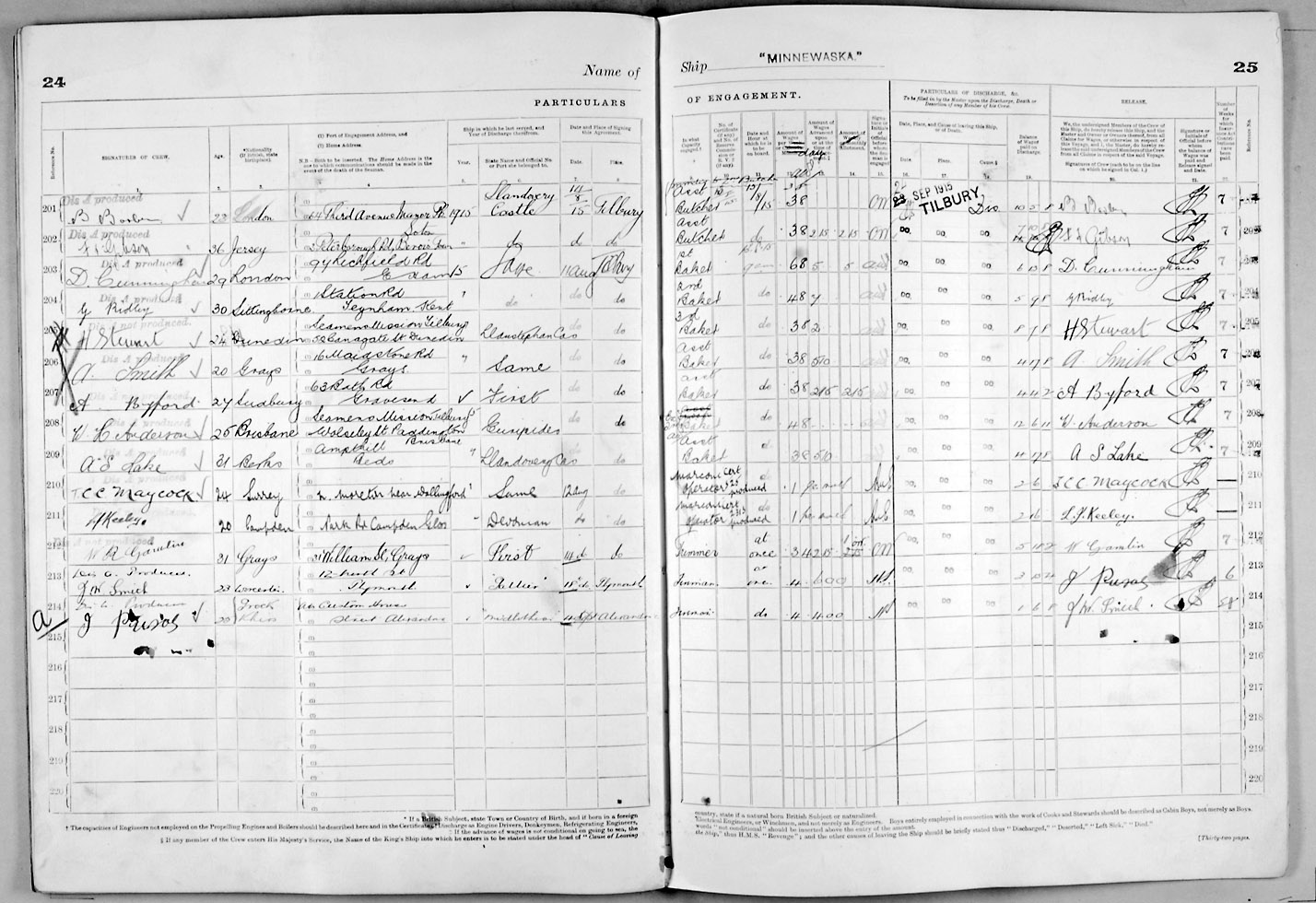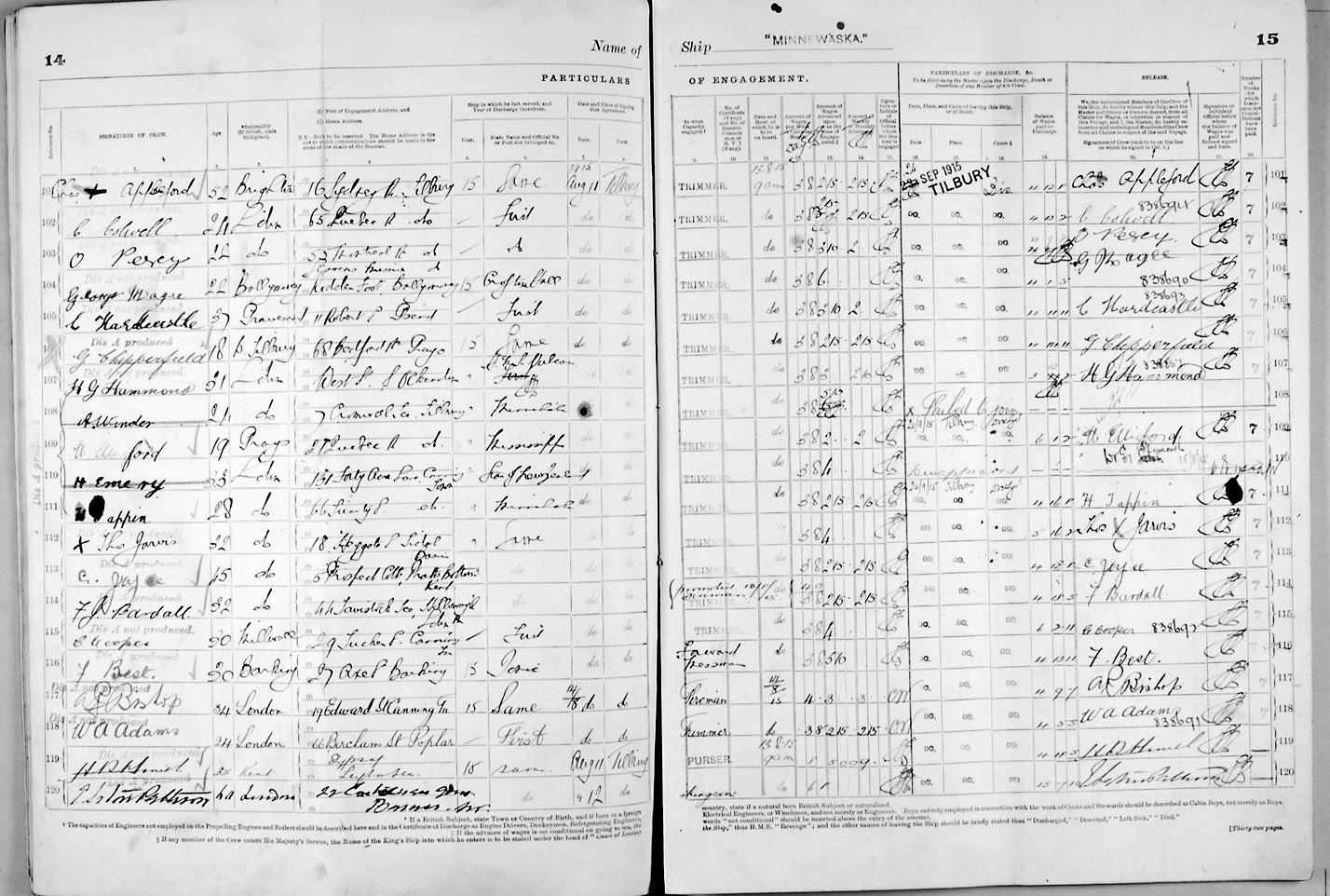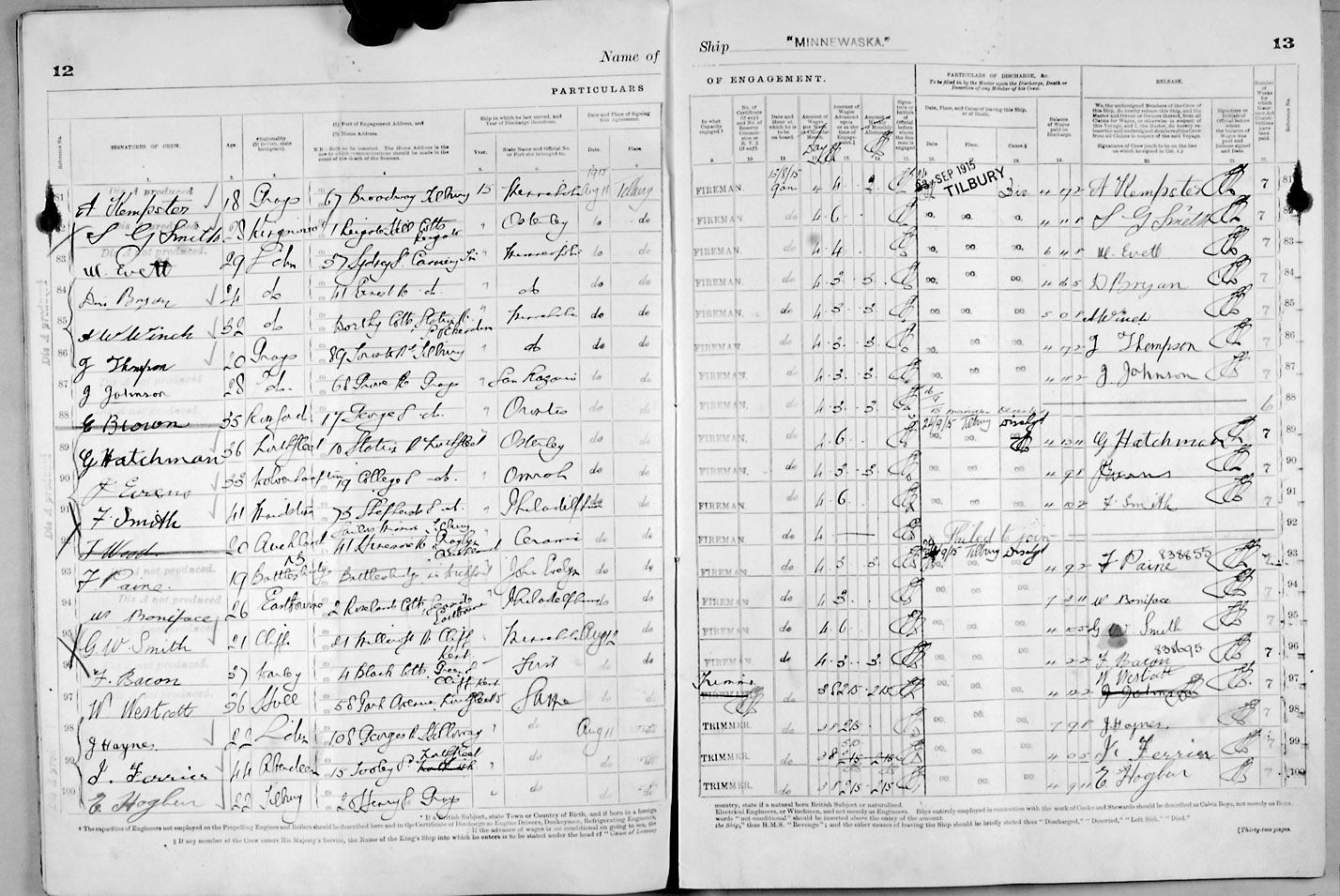 1915 crew list for the vessel 'MINNEWASKA'