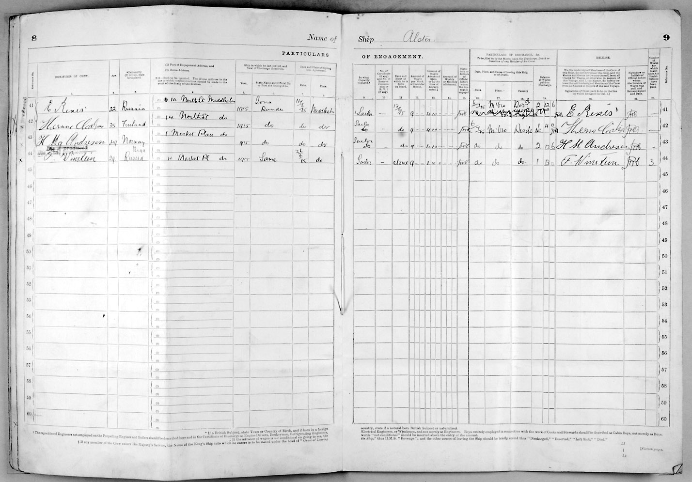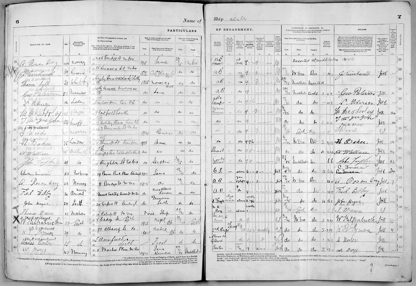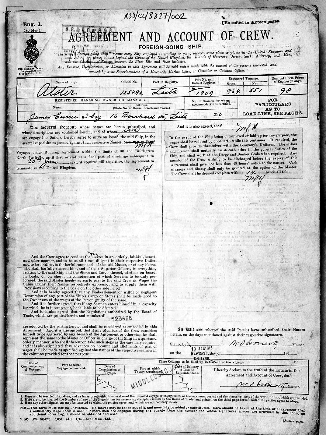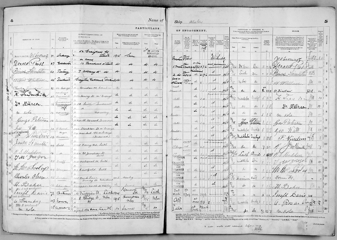 1915 crew list for the vessel 'ALSTER'