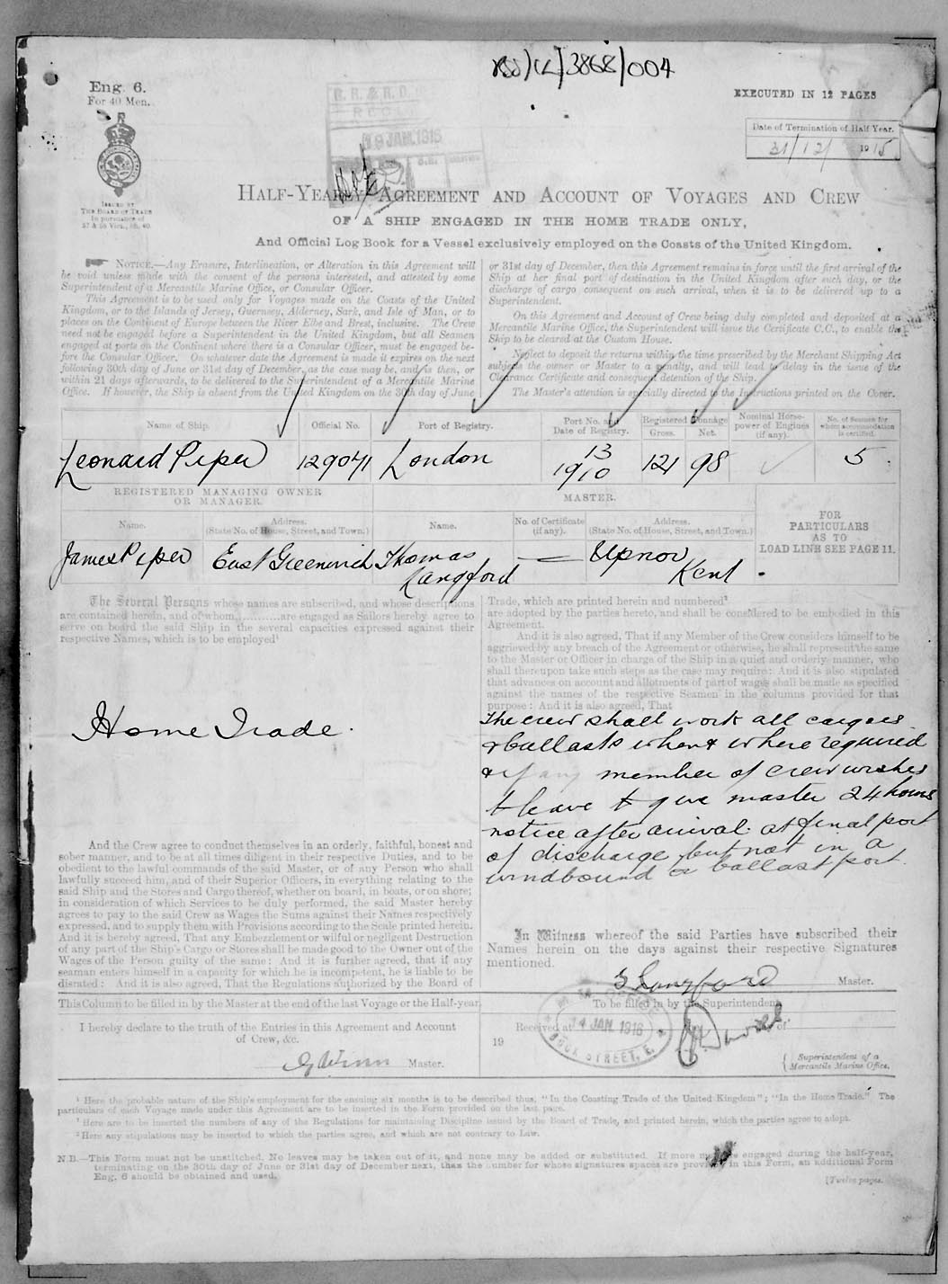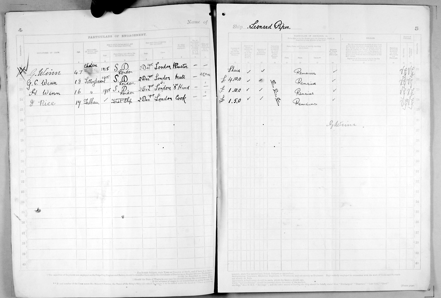 Crew list document for vessel 'LEONARD PIPER'