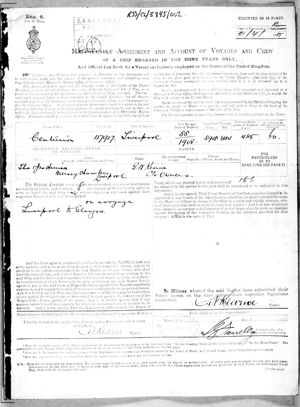 1915 crew list for the vessel 'CENTURION'