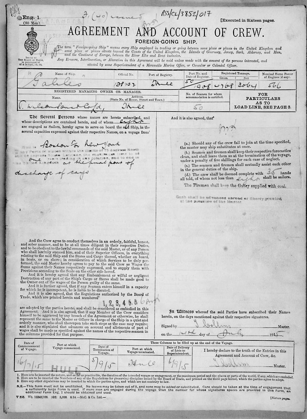 1915 crew list for the vessel 'GALILEO'