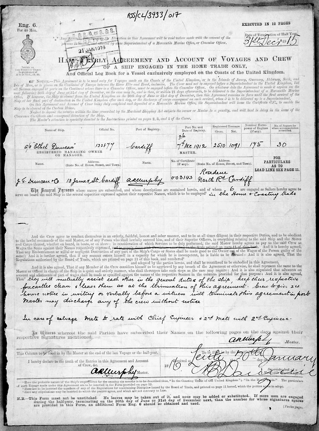 1915 crew list for the vessel 'ETHEL DUNCAN'