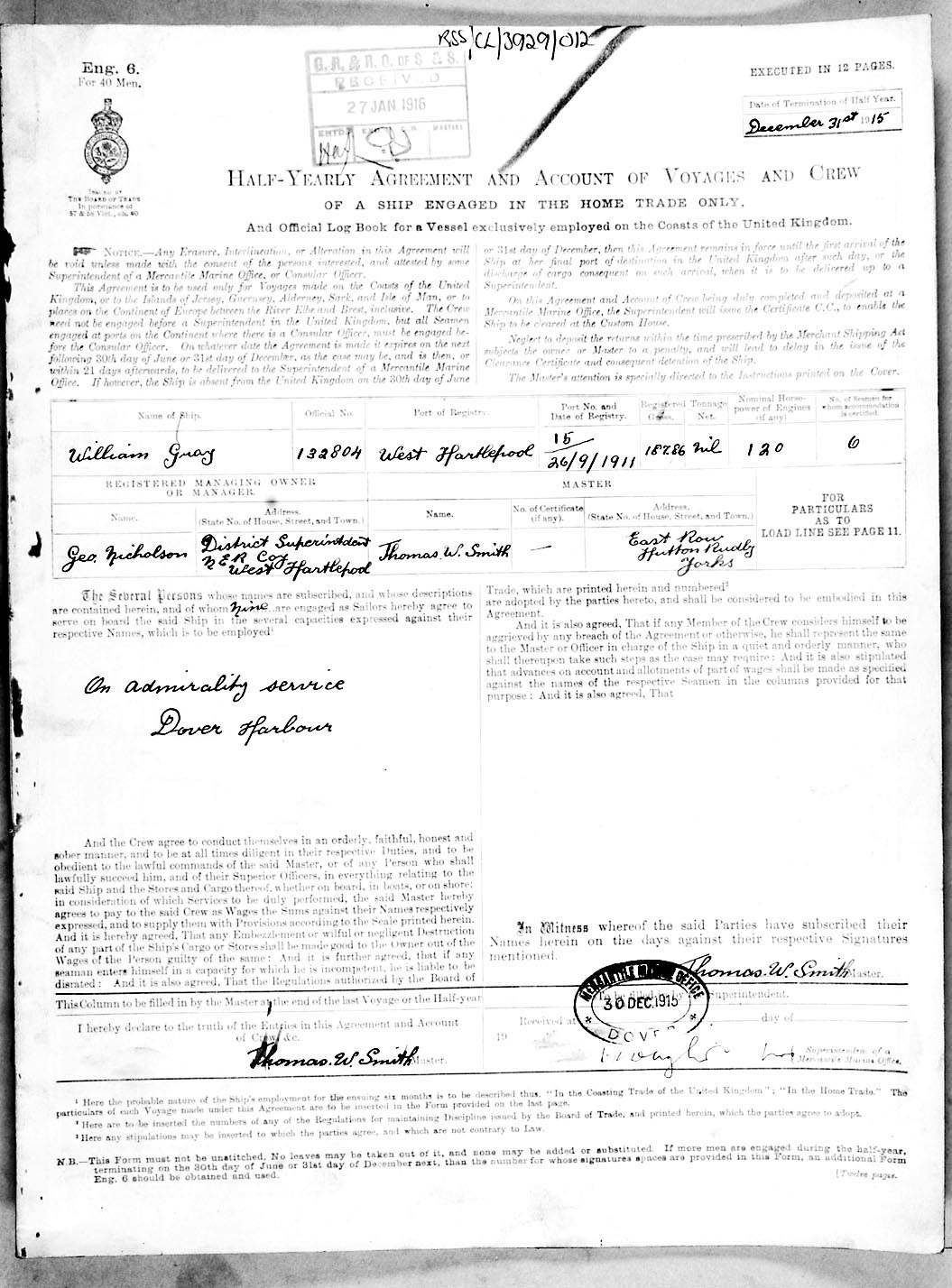 1915 crew list for the vessel 'WILLIAM GRAY'