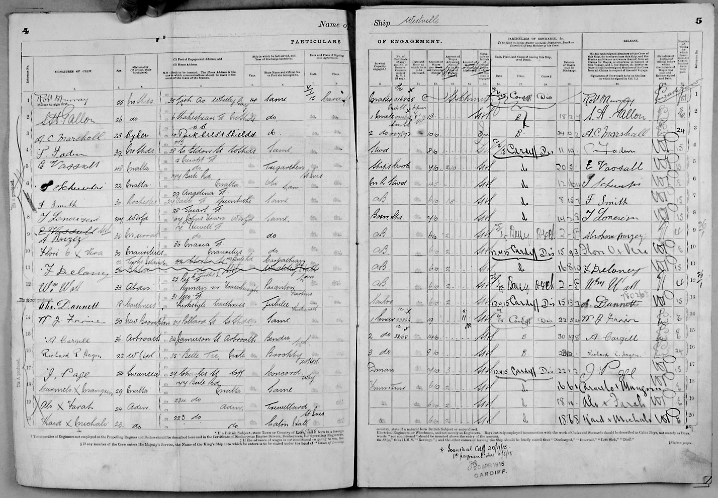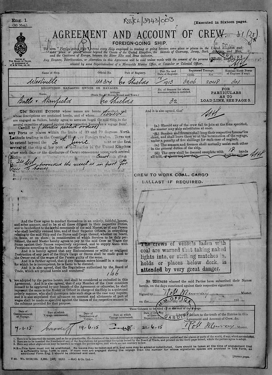 1915 crew list for the vessel 'WESTVILLE'
