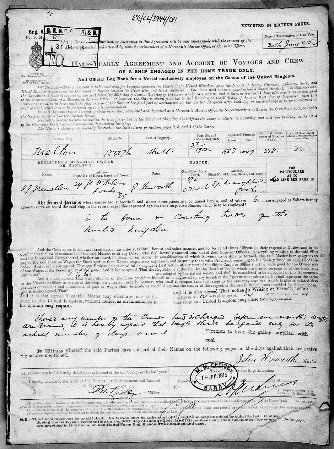 1915 crew list for the vessel 'MELTON'