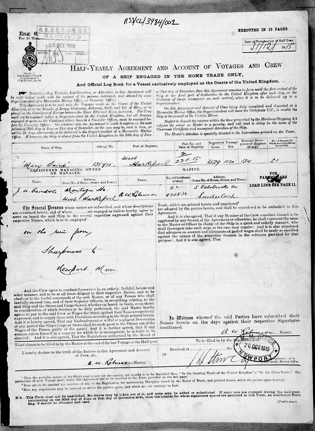 1915 crew list for the vessel 'MARY BAIRD'