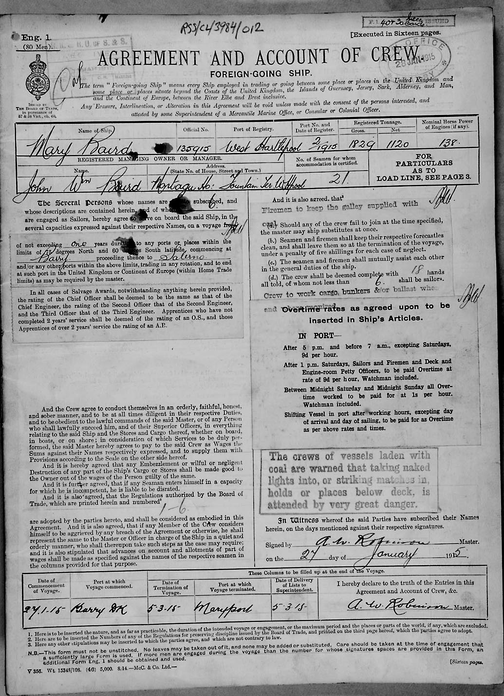 1915 crew list for the vessel 'MARY BAIRD'