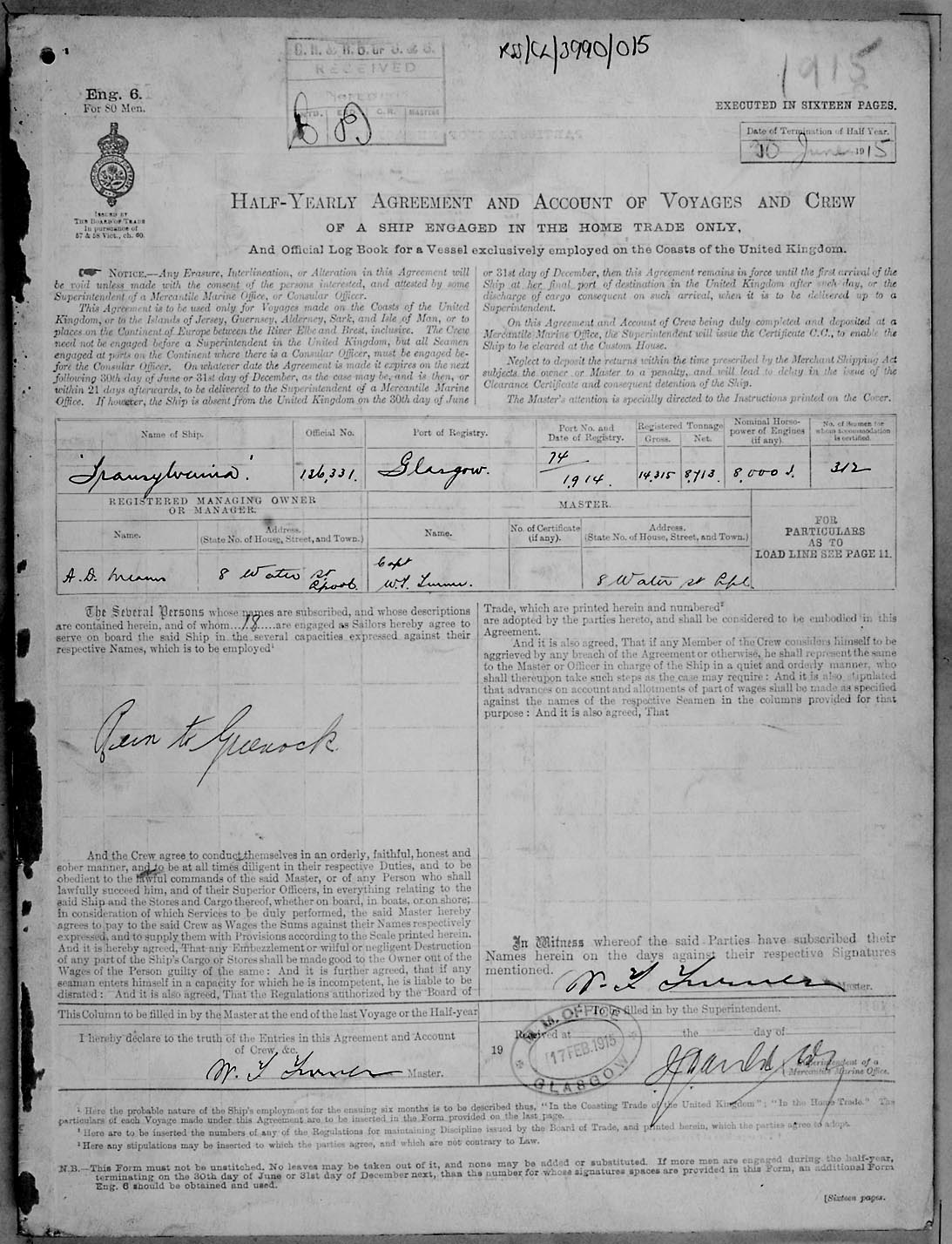 1915 crew list for the vessel 'TRANSYLVANIA'