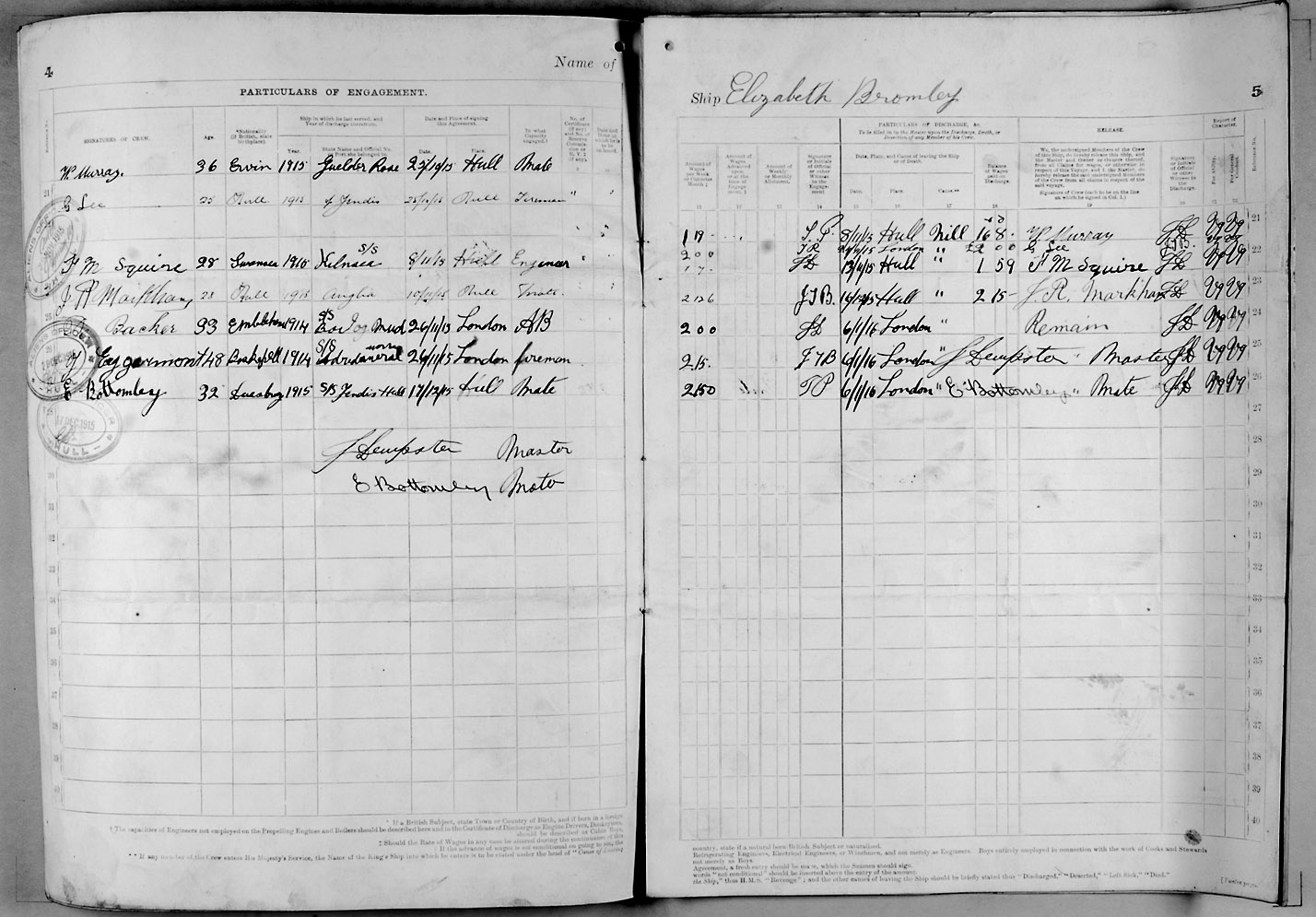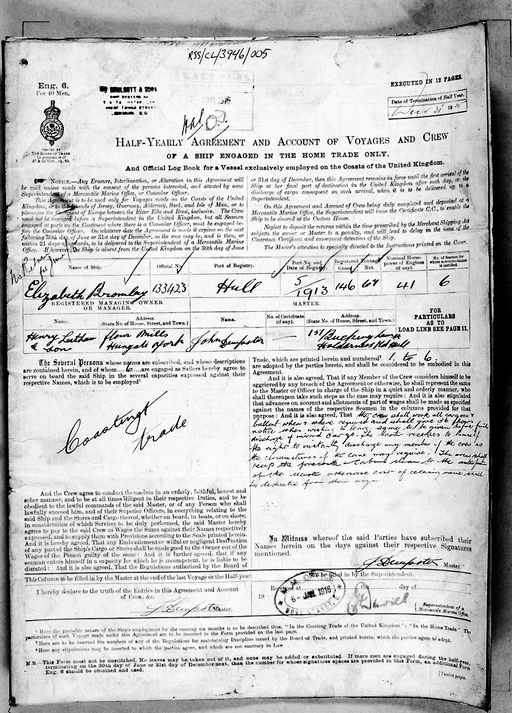1915 crew list for the vessel 'ELIZABETH BROMLEY'