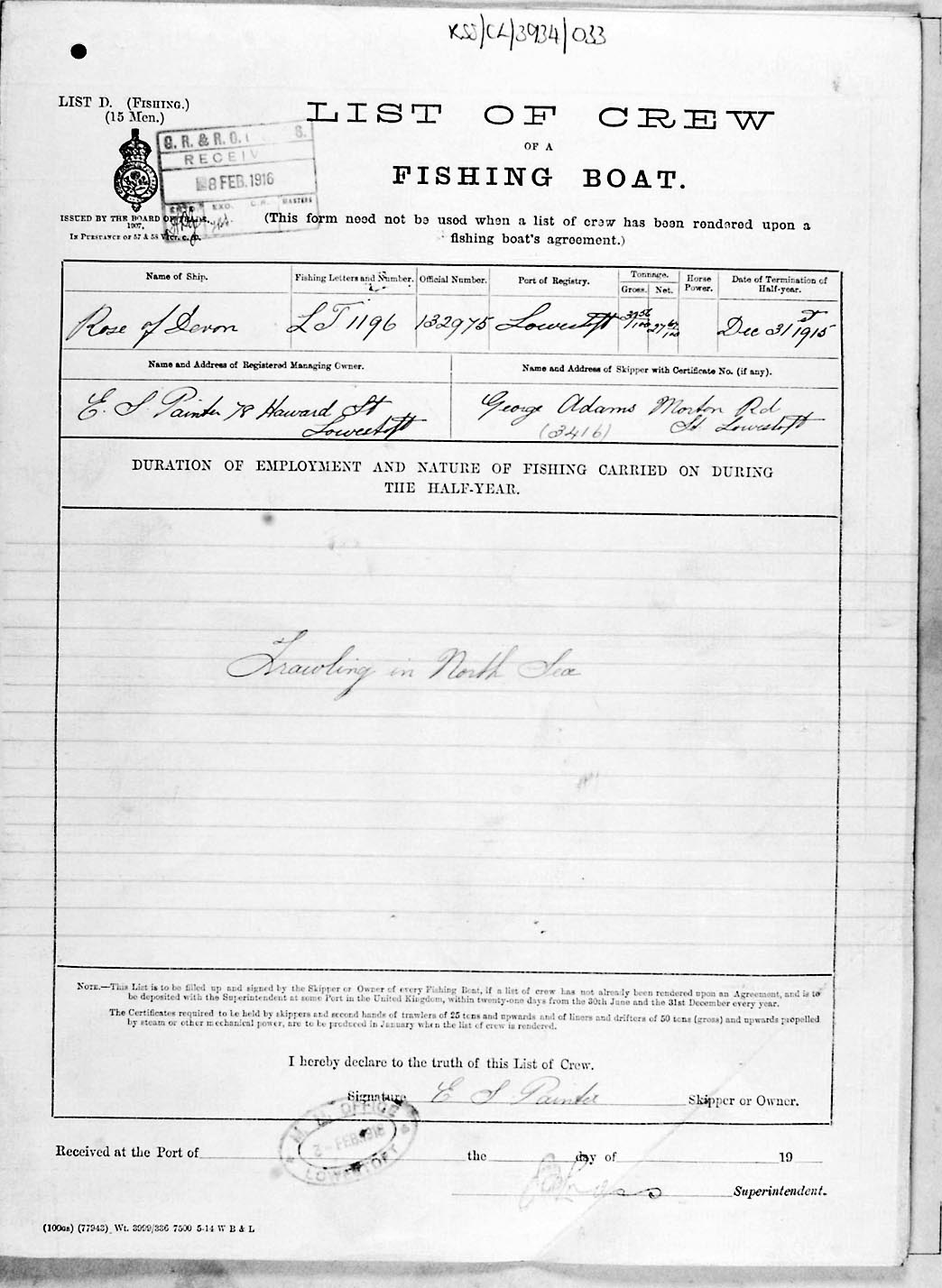 1915 crew list for the vessel 'ROSE OF DEVON'