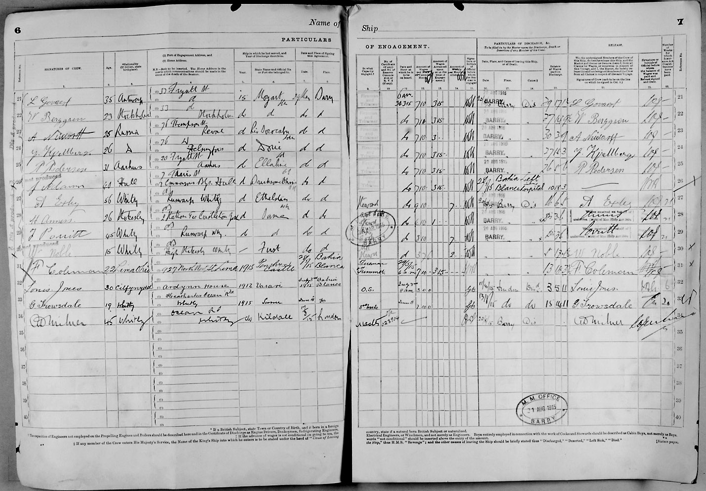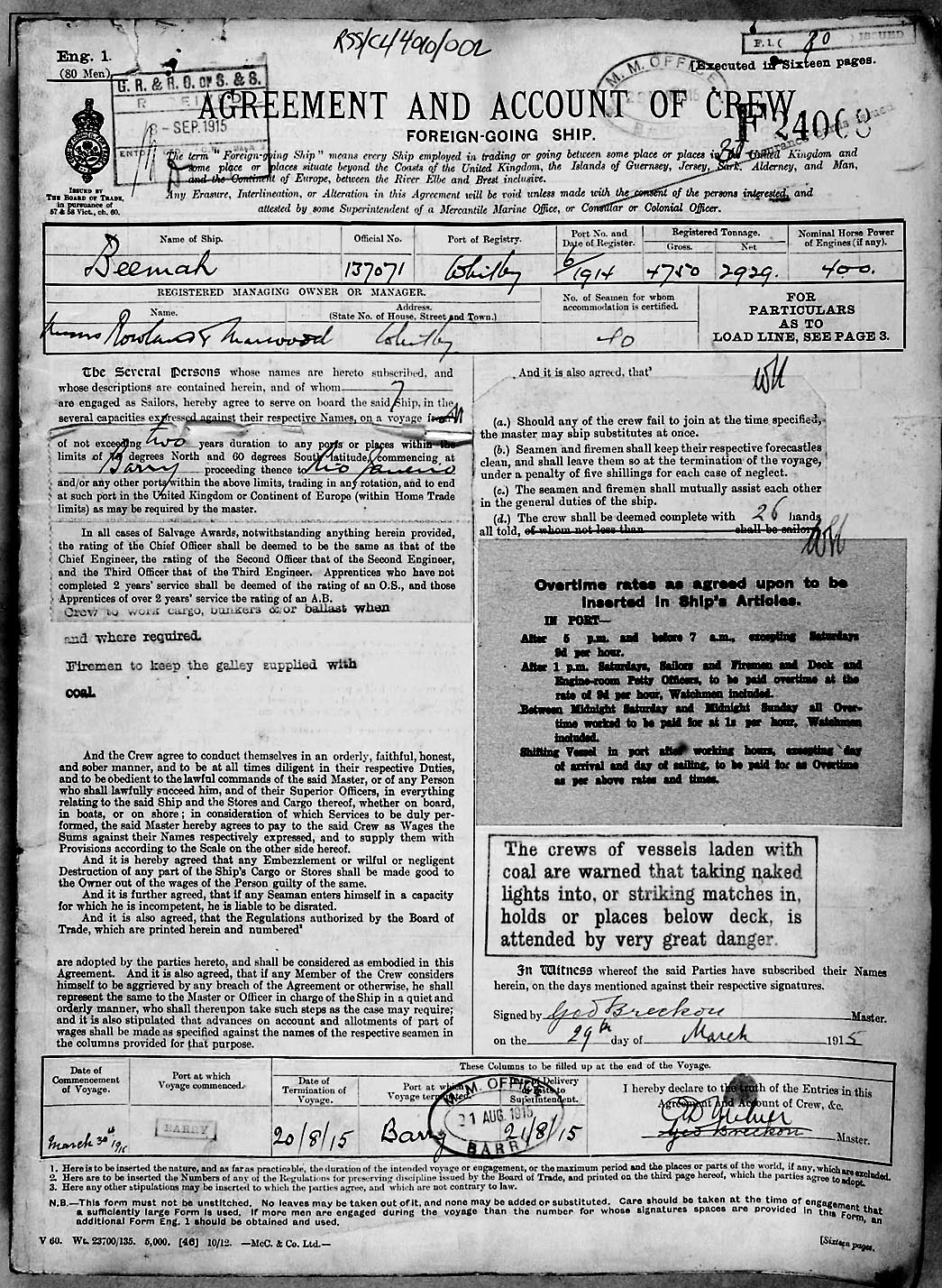 1915 crew list for the vessel 'BEEMAH'
